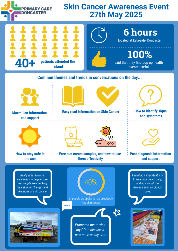 The event was a great success, attracting over 40 members of the public who visited our stand throughout the day. Held alongside our Health Van service, which offered drop-in smear tests, the event was a great opportunity to engage with the public and highlight the importance of protecting our skin, especially during the hottest months of the year when sun exposure increases.